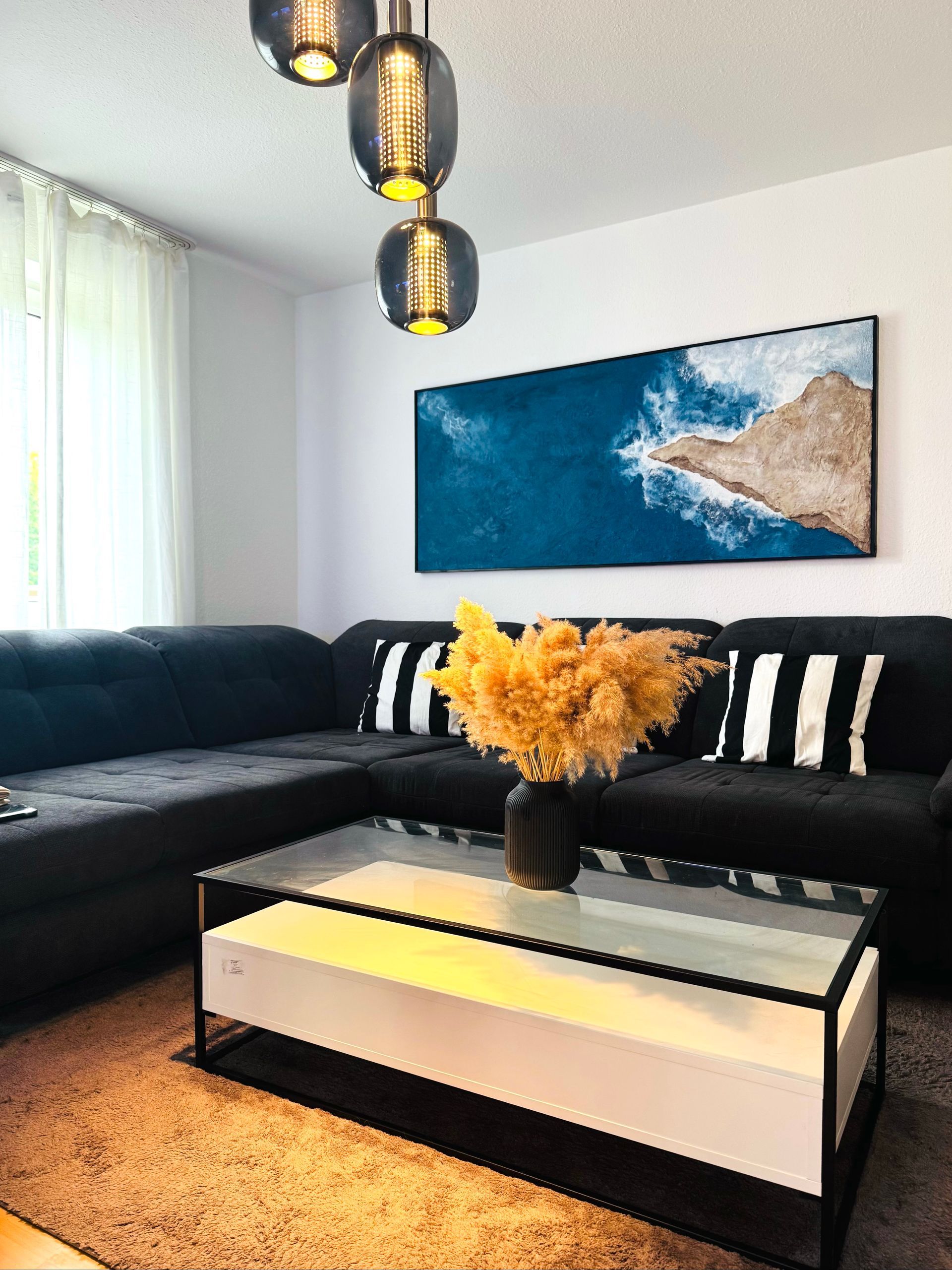 Le tableau reflète la palette de lumière et de couleurs unique de Madère – bleus doux, tons océaniques profonds et teintes côtières chaudes –, apportant un sentiment de sérénité et de connexion à la nature. C'est un hommage au rythme paisible de la mer et au charme intemporel de l'île.