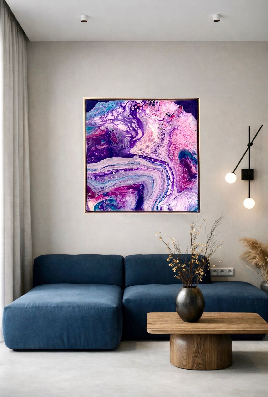 Marja is an abstract painting created using a pouring technique, where movement and chance play a central role in the composition. Measuring 60 × 60 cm, the work unfolds through fluid layers of color, with purple and pink tones flowing into one another across the surface.