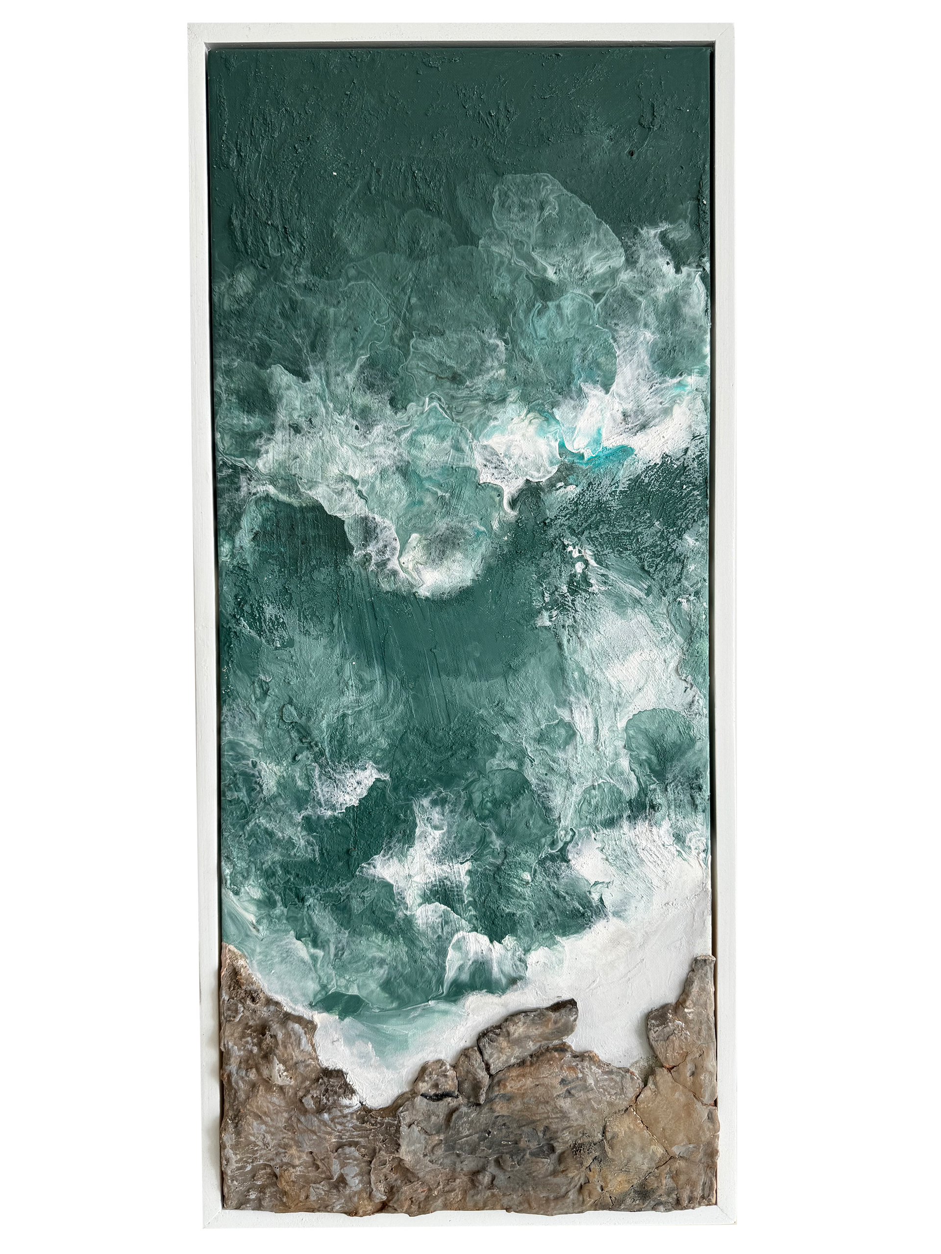 Rough textures and softened forms echo the natural rhythm of the ocean, allowing the surface itself to suggest motion and quiet intensity. Rather than depicting a specific moment, the painting translates the feeling of the sea into a physical, sensory experience—one that balances calm and energy within a compact, intimate scale.