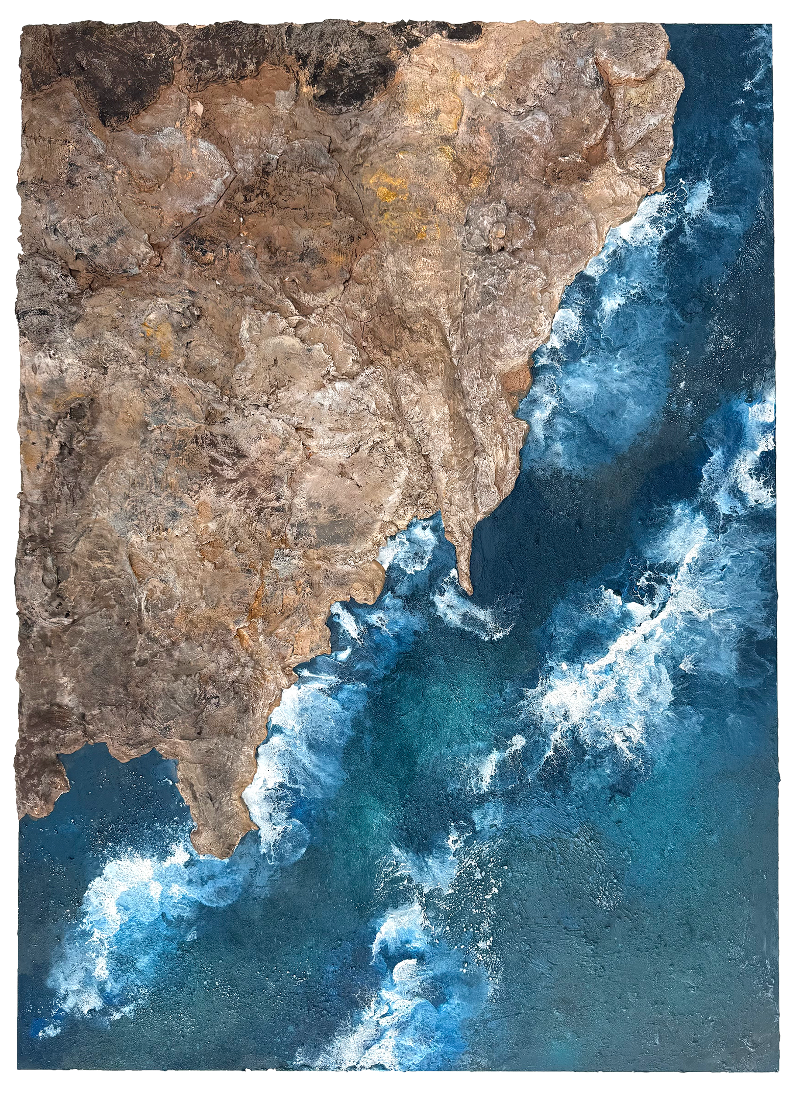 Thick layers of paint create a tactile surface, echoing the peninsula’s weathered rock and arid terrain. Warm earth tones—rust, ochre, and deep brown—build the land’s fractured surface, while the sea churns in vivid blues and shifting greens, alive with movement and light. The contrast between solid rock and restless water gives the work a dynamic, elemental tension.