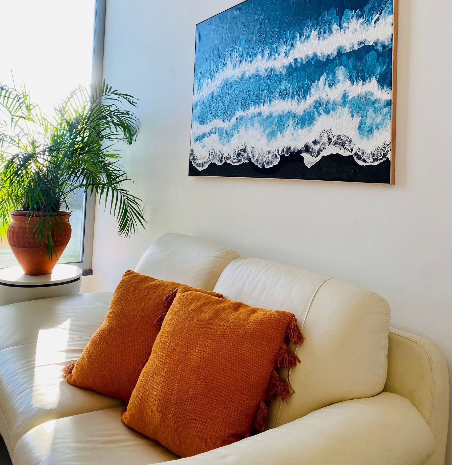 In einem Zuhause oder einer Galerie platziert, ziehen solche Werke die Aufmerksamkeit auf sich und werten die Atmosphäre auf. Sie verwandeln jede Umgebung in eine Oase natürlicher Schönheit und emotionaler Resonanz. Sie eignen sich perfekt für alle, die die beruhigende und zugleich kraftvolle Präsenz des Ozeans in ihre Wohn- oder Arbeitsräume bringen möchten.