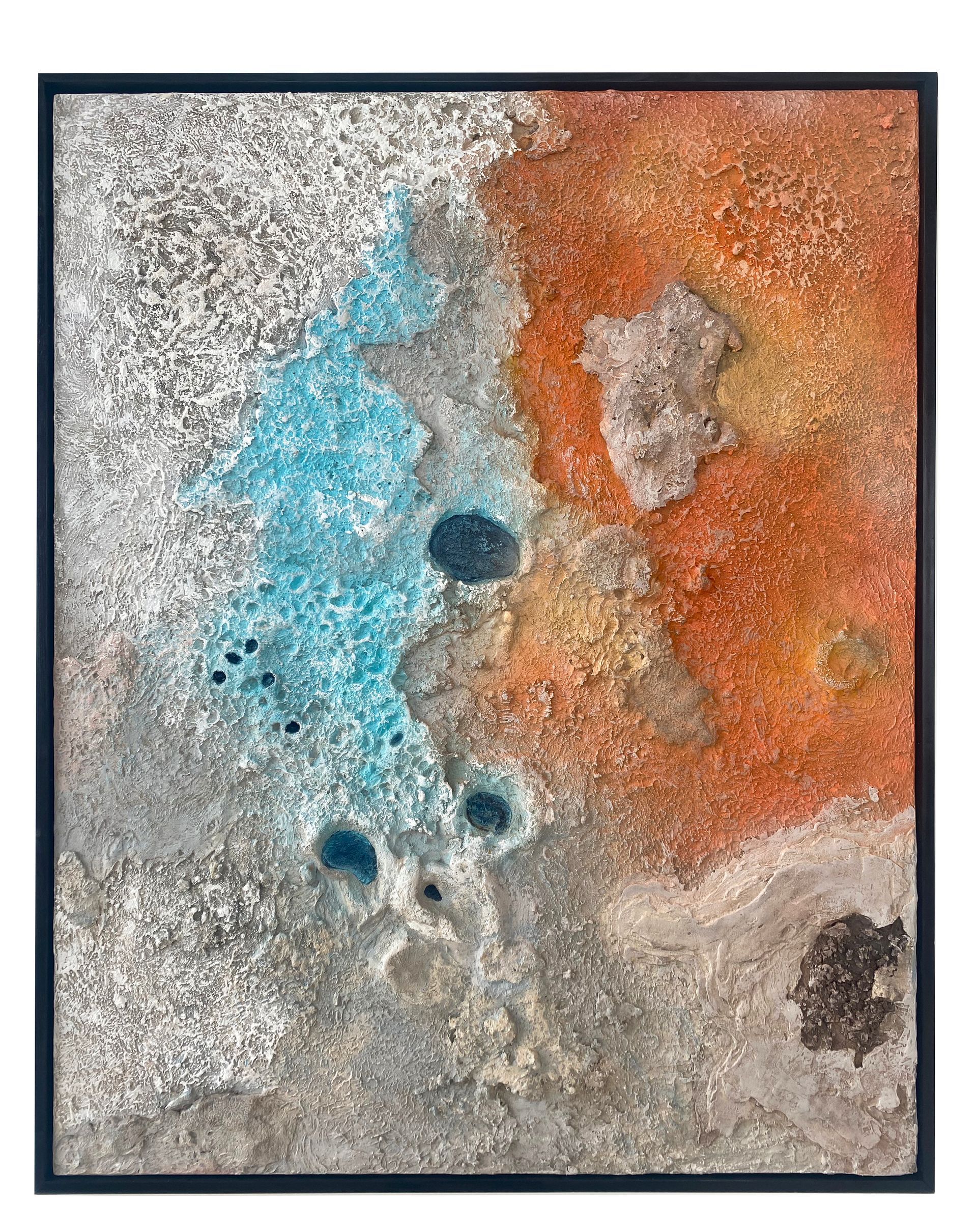 Through layered materials and rough, tactile surfaces, the work reflects the bubbling mud pools, mineral deposits, and shifting colors created by heat rising from beneath the earth. The composition embraces irregularity and raw texture, allowing the surface itself to echo the unstable, living terrain of the site.